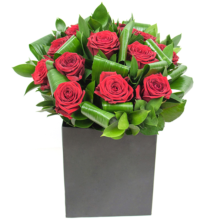 Discover refined elegance with our stunning bouquet of rich red roses, vibrant aspidistra leaves, and delicate ruscus. This unique arrangement is crafted to bring luxury and sophistication to any occasion.